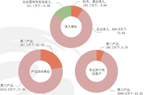 2013年末,在第二产业和第三产业法人单位中,位居前三位的行业是:批发和零售业281.1万个,占25.9%;制造业225.3万个,占20.7%;公共管理、社会保障和社会组织152万个,占14%。在有证照个体经营户中,位居前三位的行业是:批发和零售业1642.7万个,占50.1%;交通运输、仓储和邮政业878.6万个,占26.8%;住宿和餐饮业240.8万个,占7.3%(详见表1-2)。