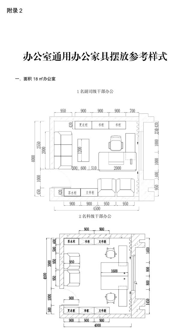 十、《指南》的附录体系。考虑到通用办公家具的品目、材质和使用场景均具有一定的发展变化性,作为推荐性、参考性标准,《指南》构建了一个开放式的附录体系,即结合当前市场实际和使用情况,先行提供2个附录,后续结合行业发展和使用情况变化及时拓展补充。本次附录主要是通用办公家具参考样式和办公室通用办公家具摆放参考样式。通用办公家具参考样式主要是根据推荐的样式、材质等指标参数,对相关品目家具实物的概念呈现。办公室通用办公家具摆放参考样式有效衔接重点选取司级、处级及处级以下干部在18㎡、24㎡、30㎡、36㎡、48㎡等5种面积的办公用房中办公的11种场景,更加直观地呈现办公家具在各种办公室面积空间的摆放布局。